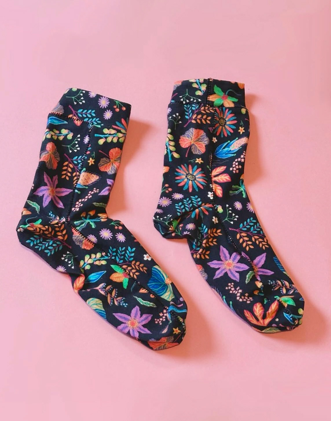 A standalone tropical pattern which started life as a sketchbook doodle and then evolved into a repeat pattern for fabric. I loved the design so much I wanted to wear it...so I drafted a 60s style dress to turn into my very own bespoke garment - complete with matching socks I just about had enough fabric leftover for!